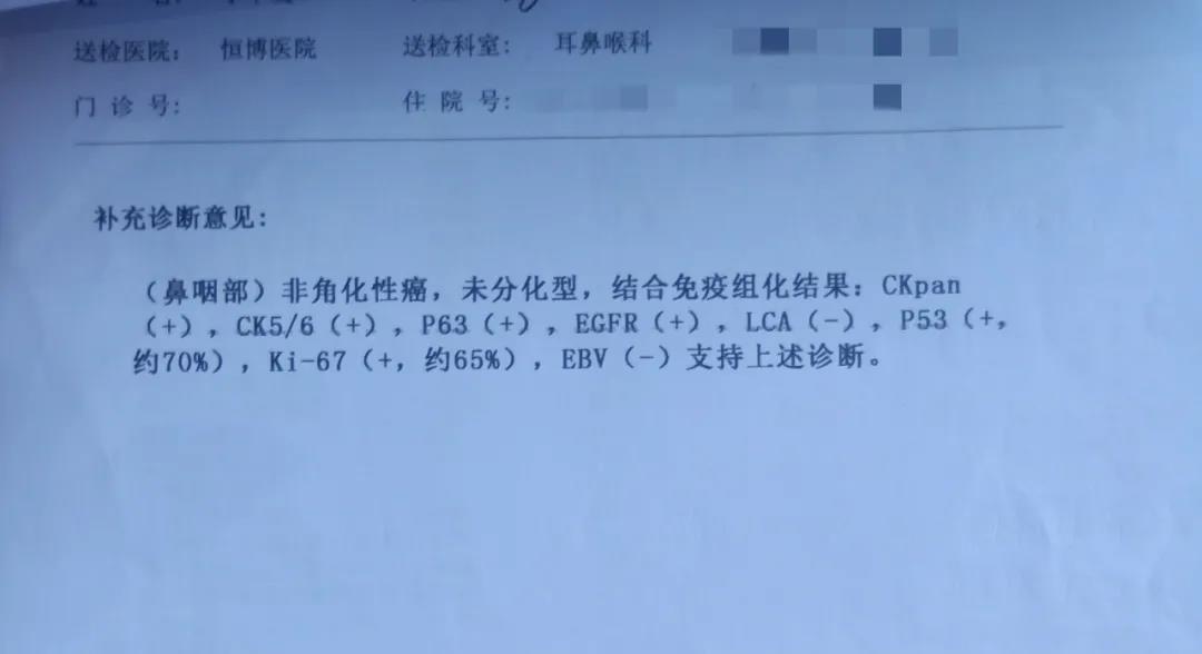 鼻咽部非角化性癌(未分化型),分型情况不太乐观,但是所幸发现及时。